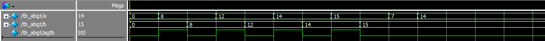 테스트벤치로 시뮬레이션 돌린 결과이다. 파형을 보면 A가 B보다 클 때만 출력이 1이 되는 것을 확인할 수 있다.