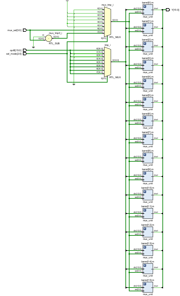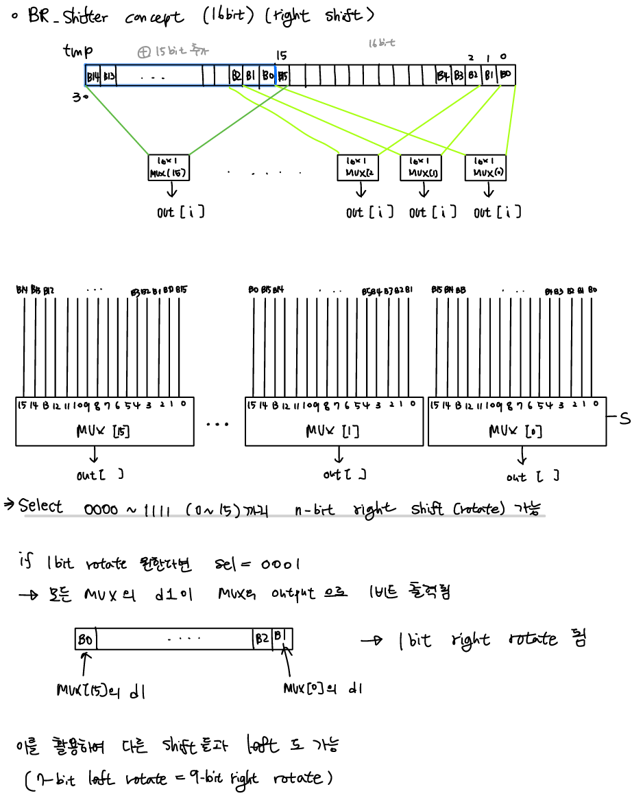 위의 그림과 같이 먼저 right rotate하는 BR shifter를 생각했다. 31 bit짜리 tmp를 선언한 후 오퍼랜드(oprB) 값 16bit를 할당하고 그 뒤에 15bit를 할당한다. 그리고 16 bit 짜리 먹스 16개를 만들어서 그림과 같이 한 비트씩 shift되도록 할당한다.