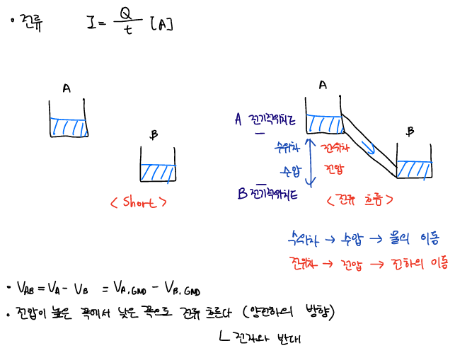 if 물이 차 있는 비커 두개가 있는데 연결이 안되어 있으면 short, 연결하면 높은 쪽에서 낮은 쪽으로 흐르면 전류이다.