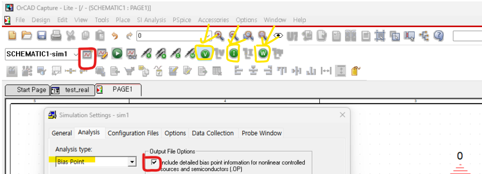 V, I, W 의 아이콘을 클릭하면 각각 전압, 전류, 전력에 대한 시뮬레이션 결과값을 확인할 수 있다.