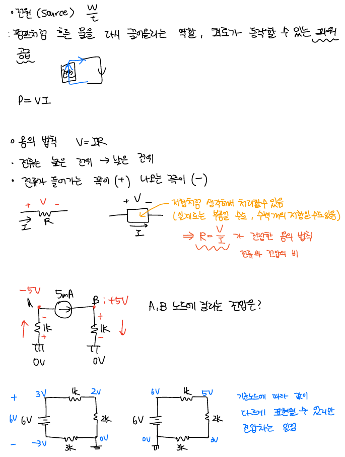 전기적위치에너지가 높은 곳에서 낮은 곳으로 전하가 흐른다. -> 전류, 전위차에 의해 전압이 발생하고 전압에 의해 전하가 이동한다. 즉 전류가 발생한다.