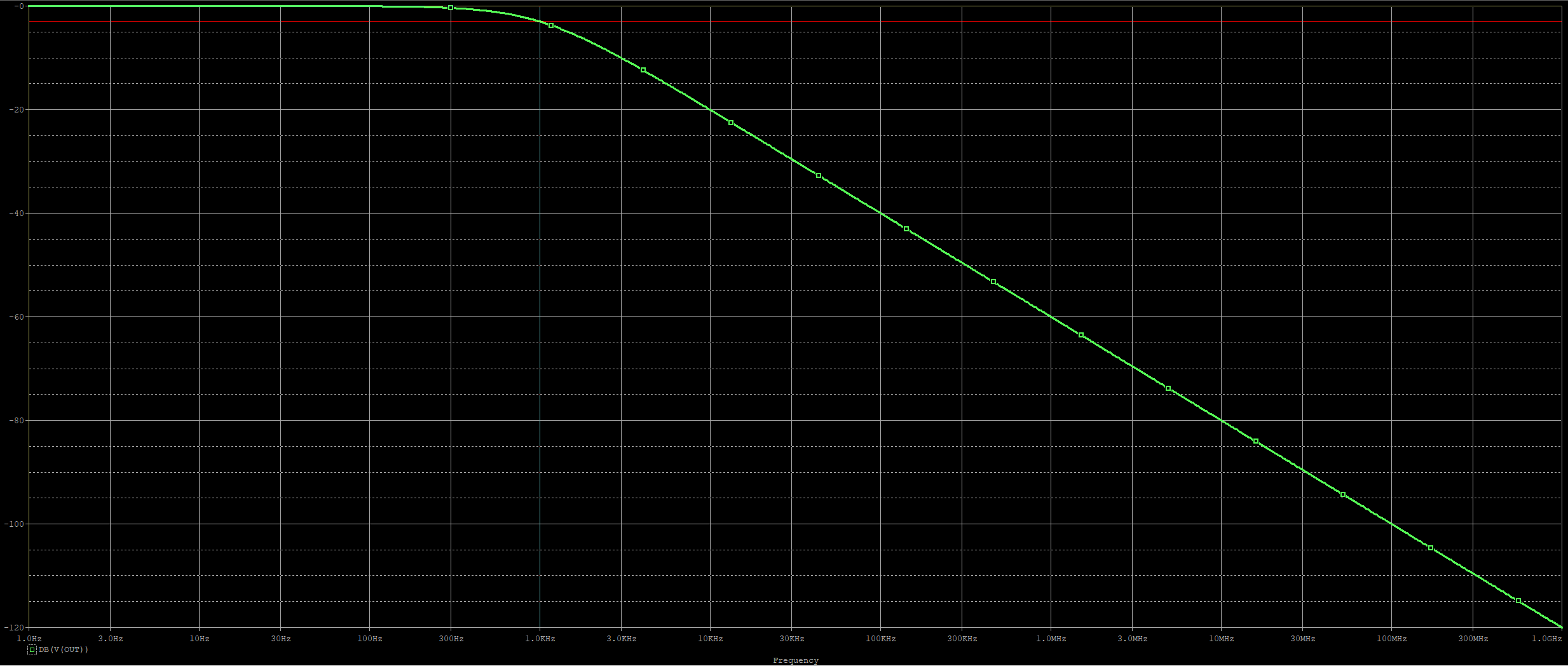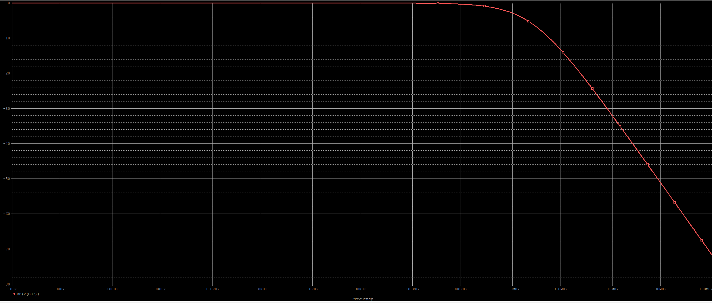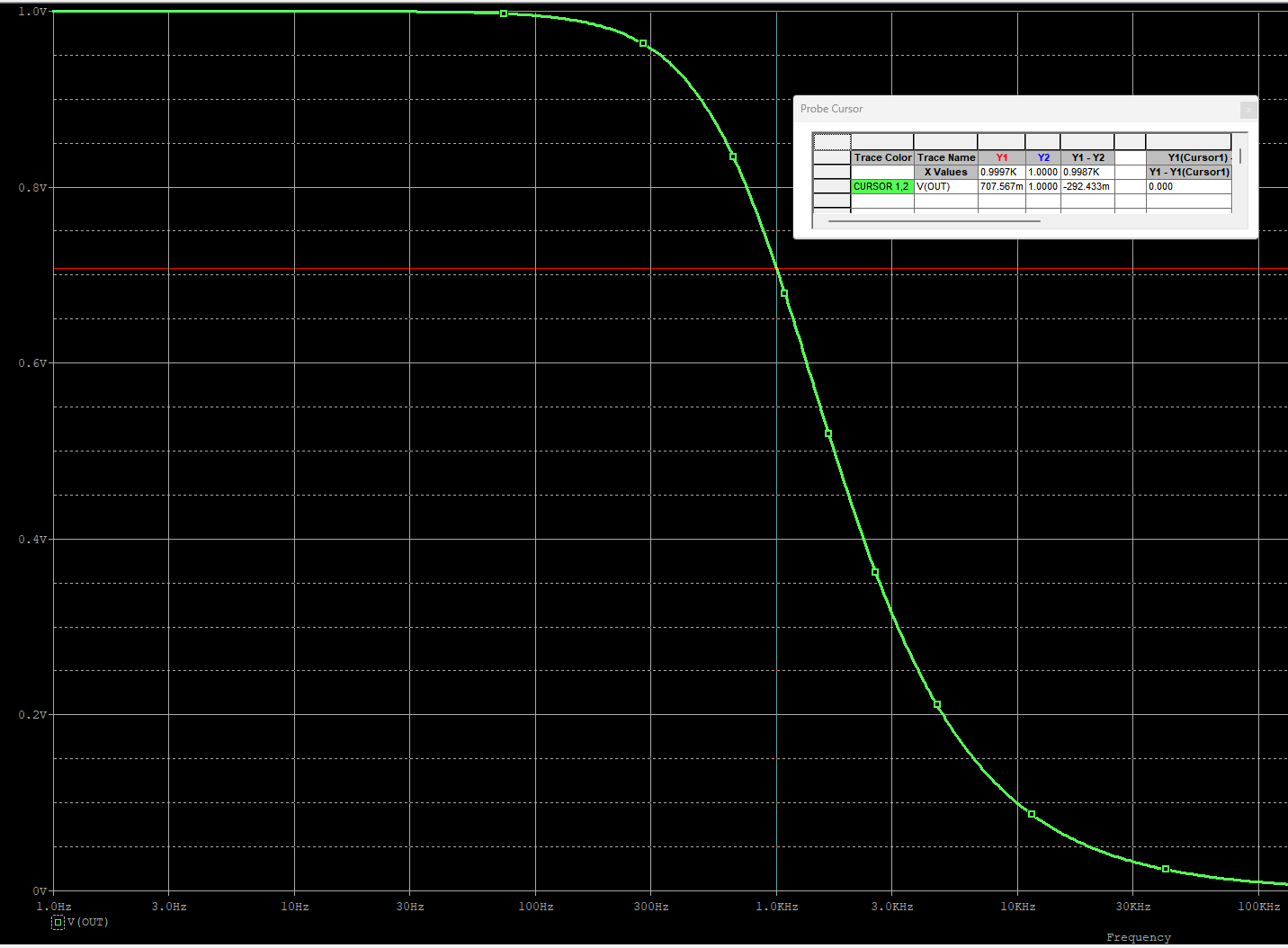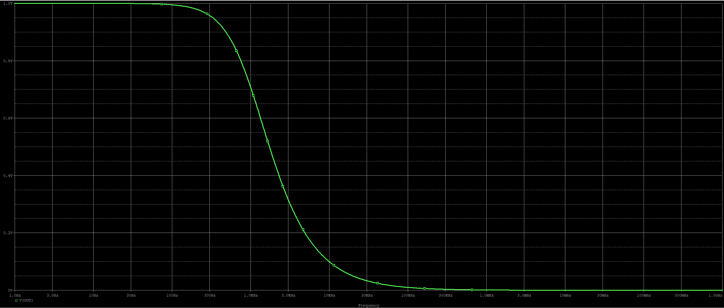 100Hz까지 일정한 출력(=1V)이 나오다가 1MHz를 넘어가면서부터는 출력(=0V)이 나오지 않는 것처럼 보인다. 즉 회로는 정상적으로 동작하지 못하고 있다. 보통 일정한 출력에서 0.707 까지가 정상 출력으로 하며 차단주파수/cutoff freq/반전력주파수/corner freq/3DB주파수 라고 부른다.