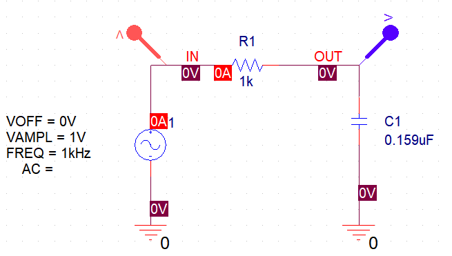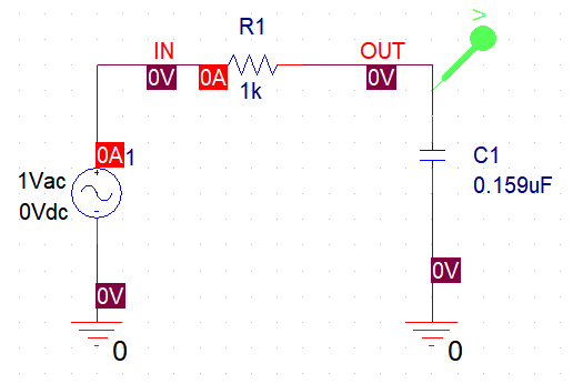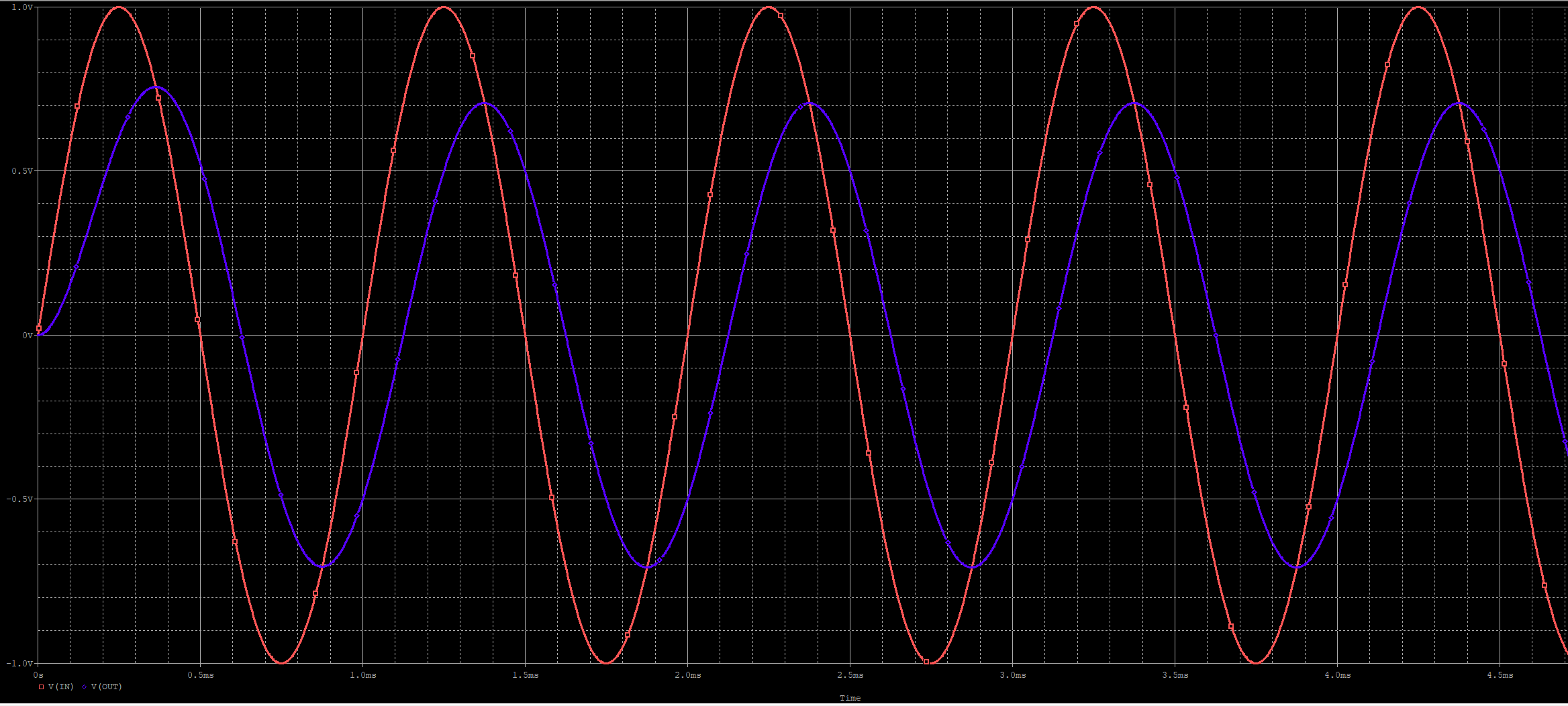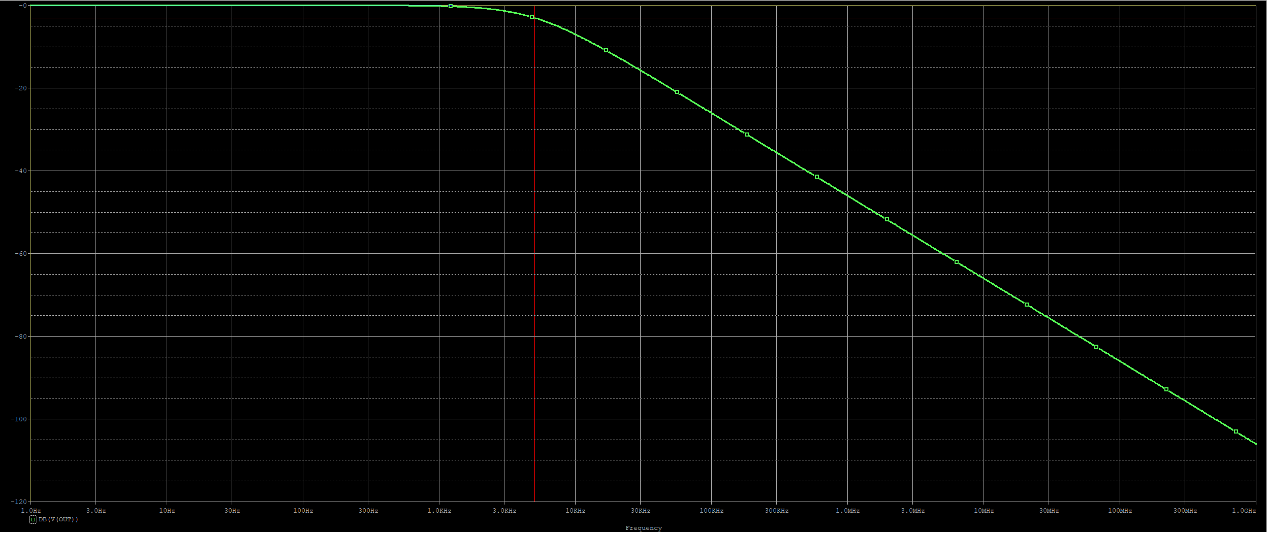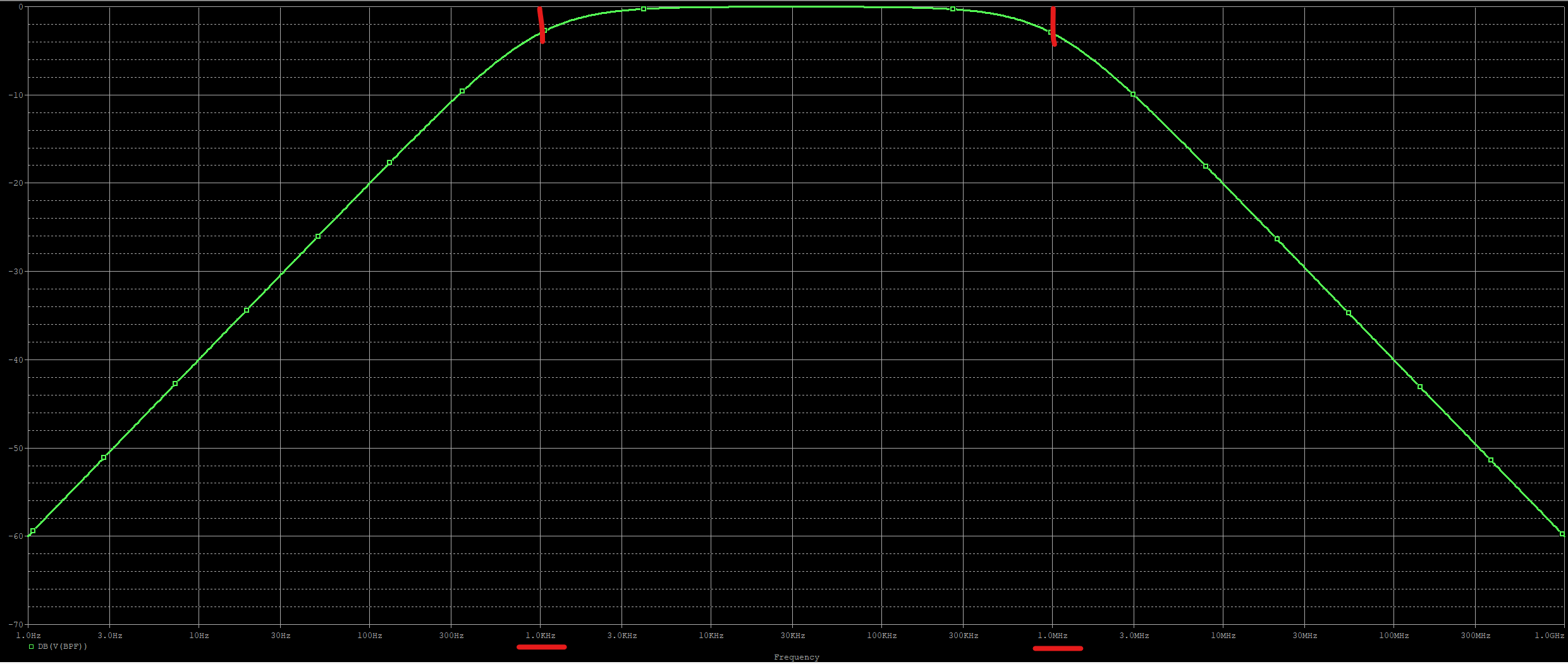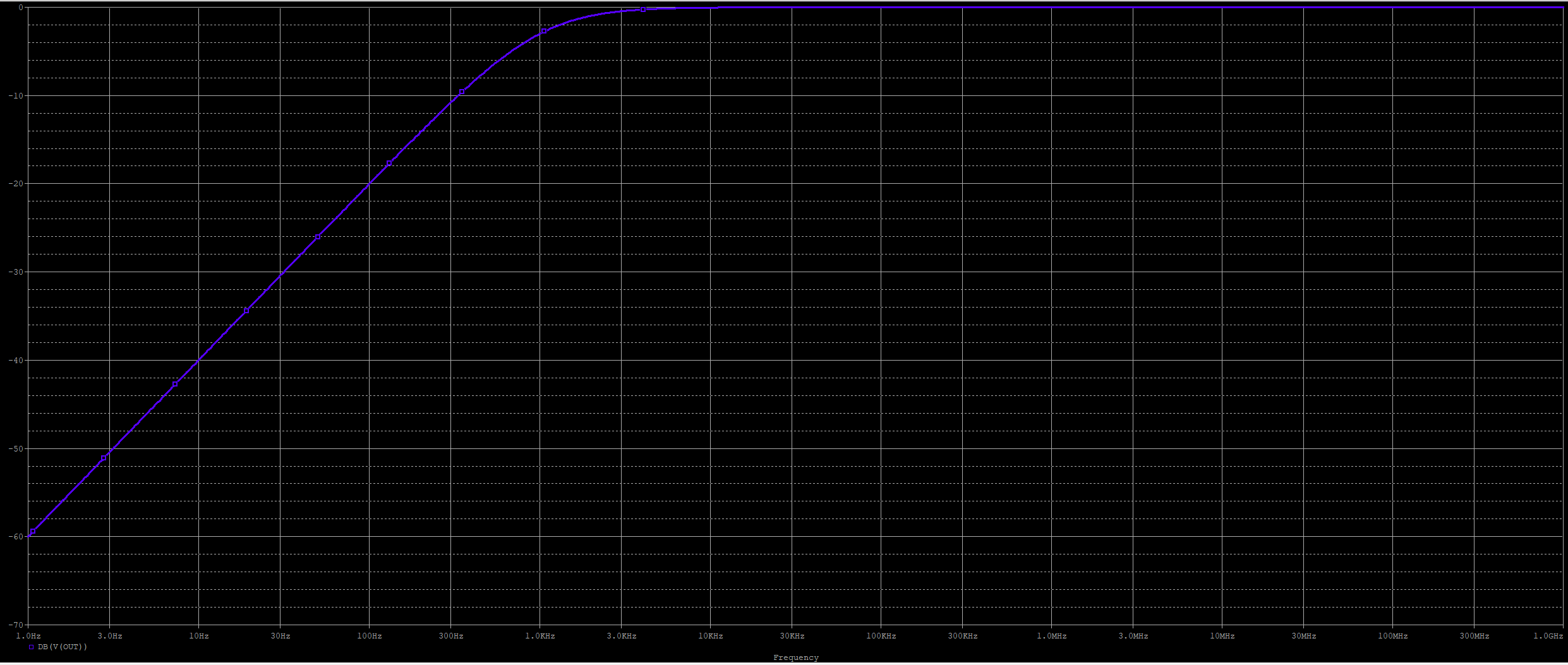 100Hz까지 일정한 출력(=1V)이 나오다가 1MHz를 넘어가면서부터는 출력(=0V)이 나오지 않는 것처럼 보인다. 즉 회로는 정상적으로 동작하지 못하고 있다. 보통 일정한 출력에서 0.707 까지가 정상 출력으로 하며 차단주파수/cutoff freq/반전력주파수/corner freq/3DB주파수 라고 부른다.
