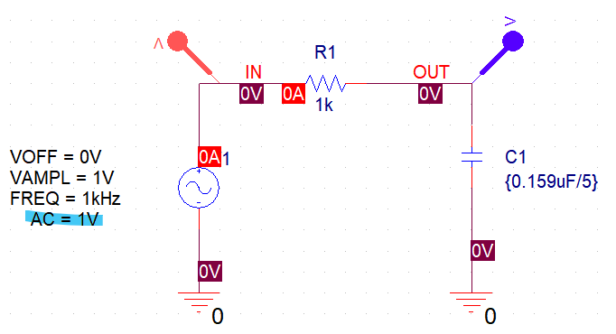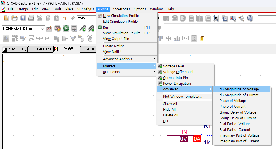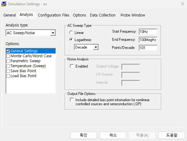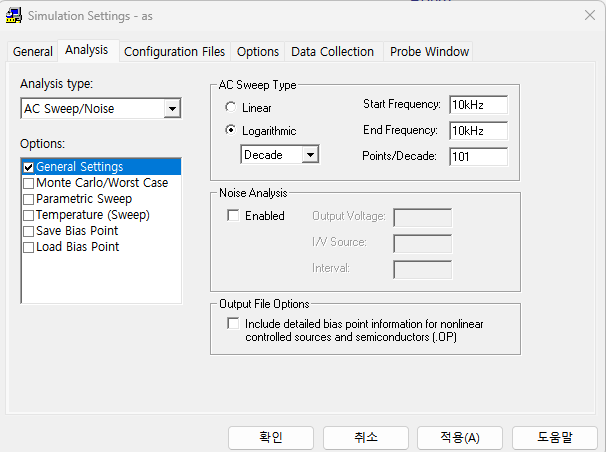 VSIN 전압원에서 AC를 활용해본다. AC값을 설정하면, DC해석에서는 반영되지 않고, AC 해석시에 VAC처럼 적용이 된다. 시뮬레이션 셋팅은 AC sweep으로 바꾼다.