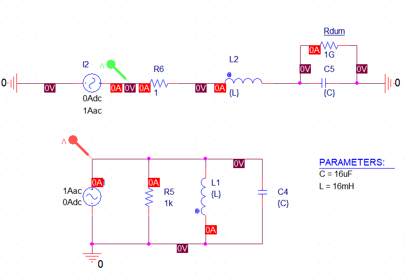 직렬 공진회로와 병렬 공진회로를 구성하였다. 직렬 공진회로에서 1G 저항을 달아준 이유는, SPICE 가 동작적 해석을 할 수 없기 때문이다. (open동작) 따라서 1G저항을 달아줌으로써 open과 마찬가지인 회로를 만들어준 것이다.