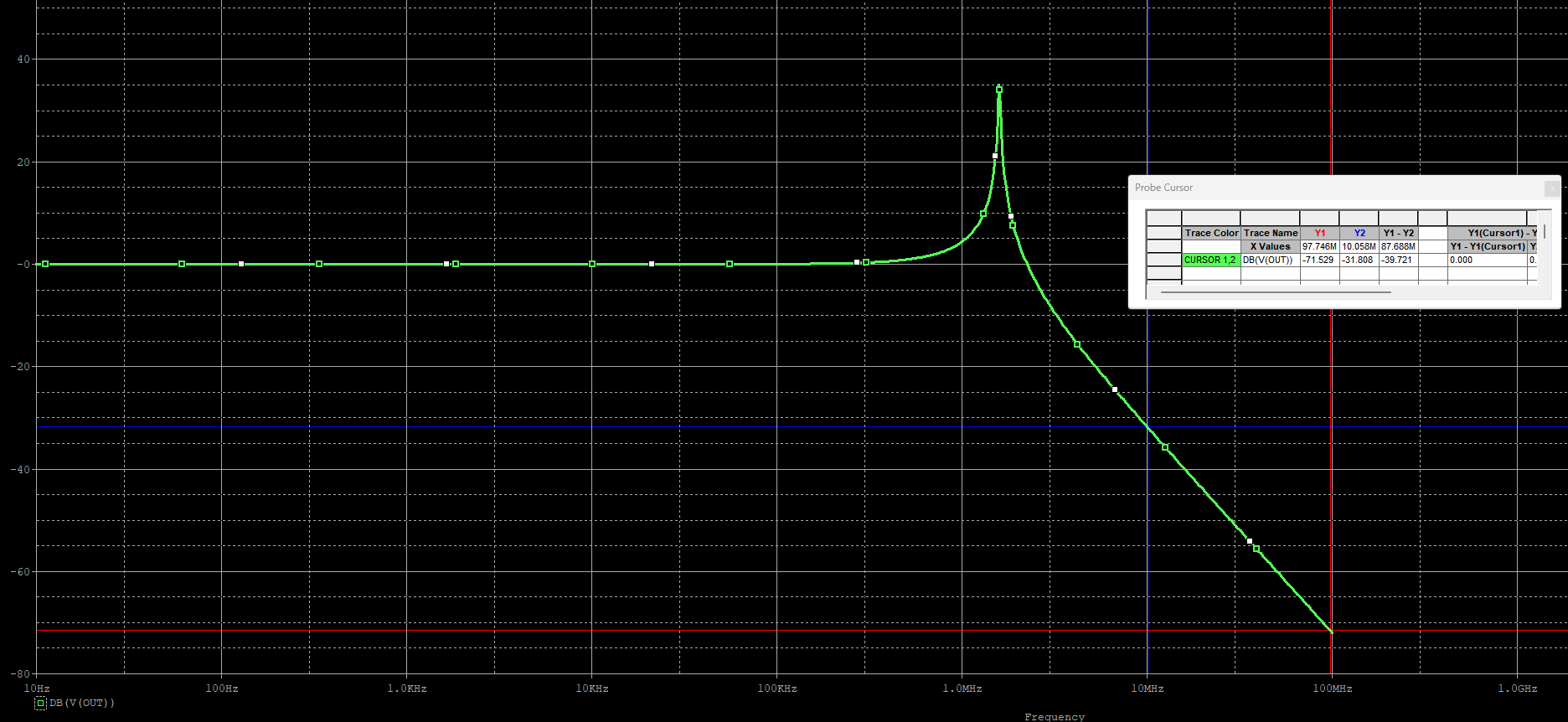 2차 회로를 구성하였고 결과를 보면 10배차이, 40dB 기울기를 확인할 수 있다. 다만, 튄 부분 peaking 영역이 있는데 이는 공진회로 때문에 생긴 것이다.