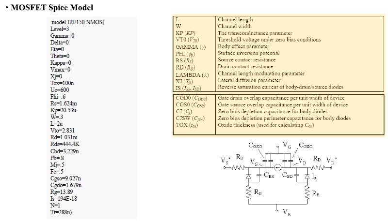 level은 0부터 8 까지 있는데, 8에 가까울수록 정교한 모델링이다. L은 channel length이고 Vto는 문턱전압이다. 또한 MOSFET는 특성상 기생 커패시턴스가 많아, 주파스 특성 잡기가 어렵다. 감마는 바디 이펙트, 람다는 얼리전압을 결정짓는 파라미터이다.
