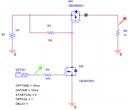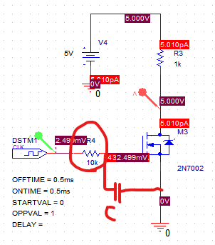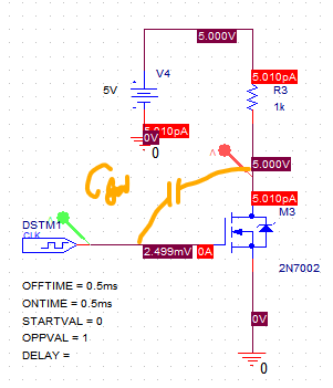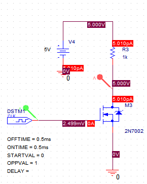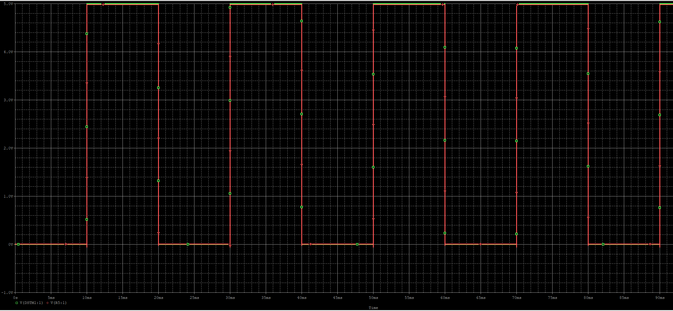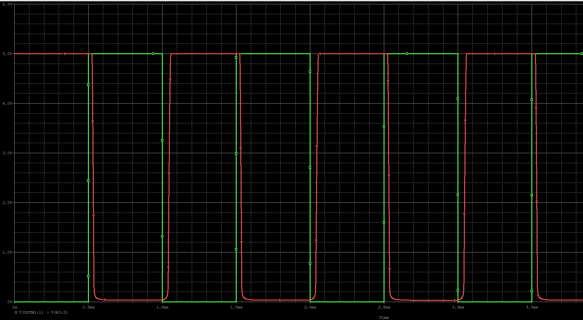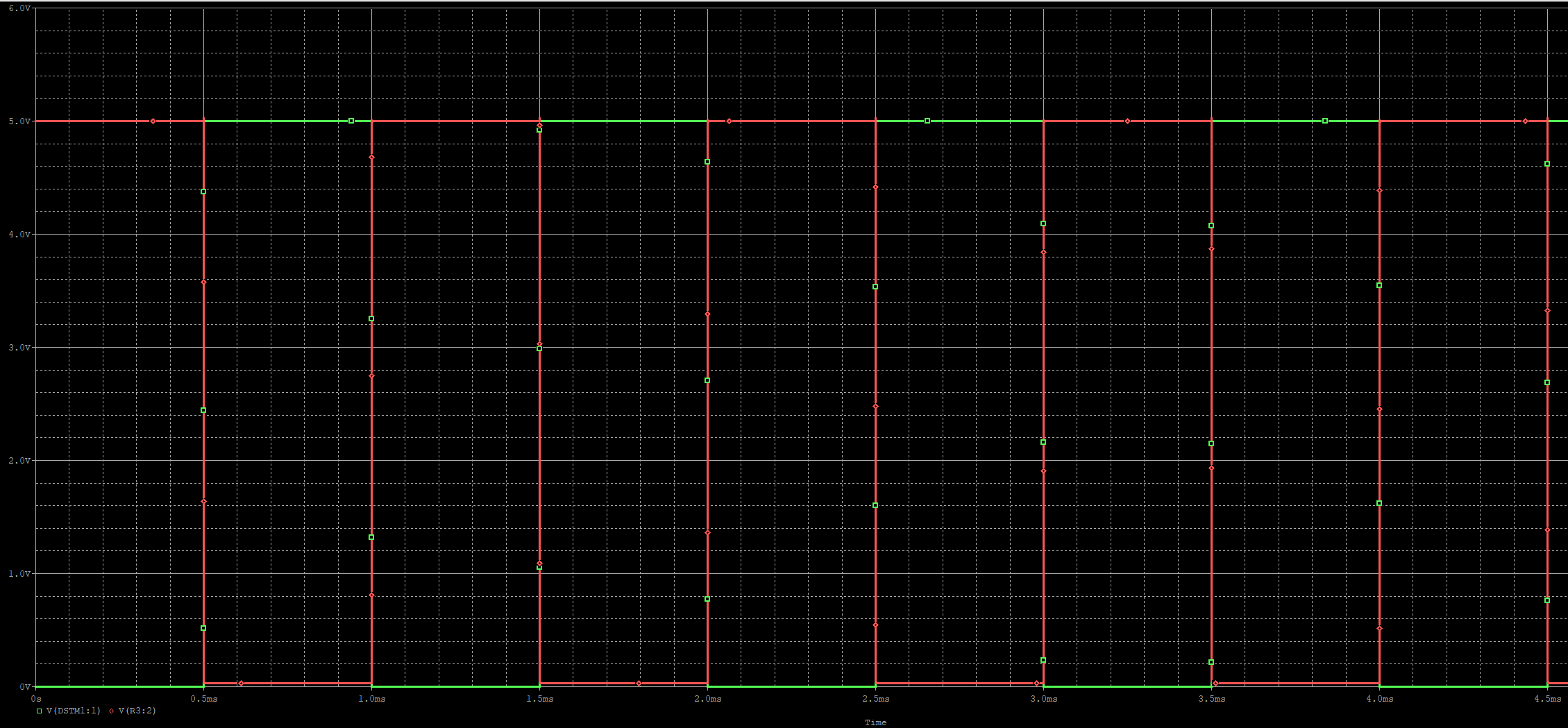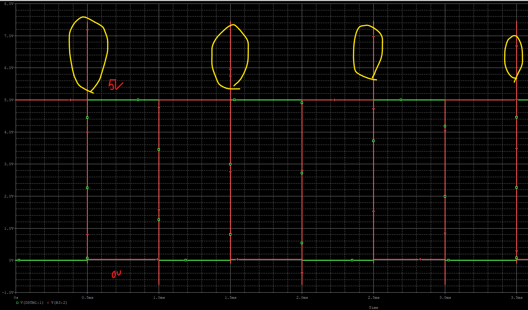 input이 5v이면 output 0, input이 0이면 output 5v로 의도대로 파형이 출력되고 있다. 하지만 모서리 부분이 튀는 현상이 발생하고 있다.
