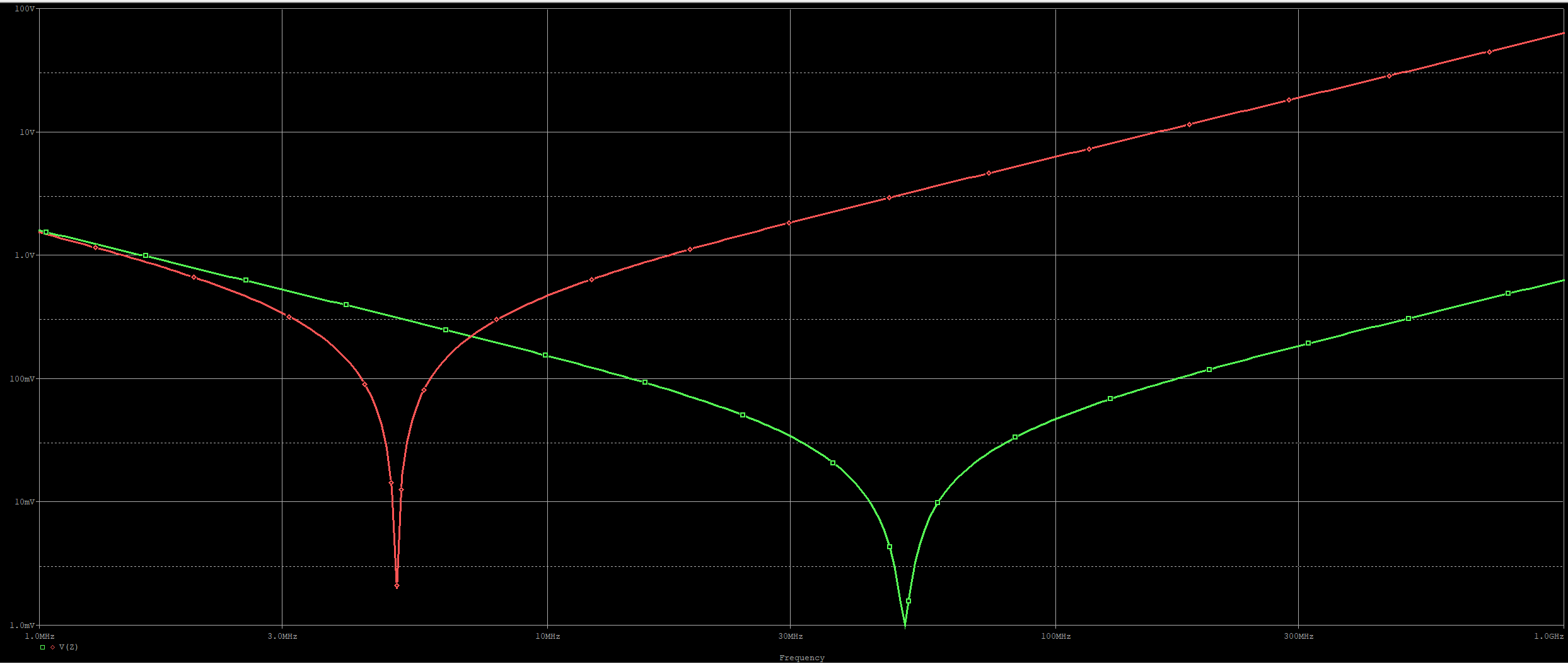 초록색이 0.1h, 빨간색이 10nH의 결과이다.