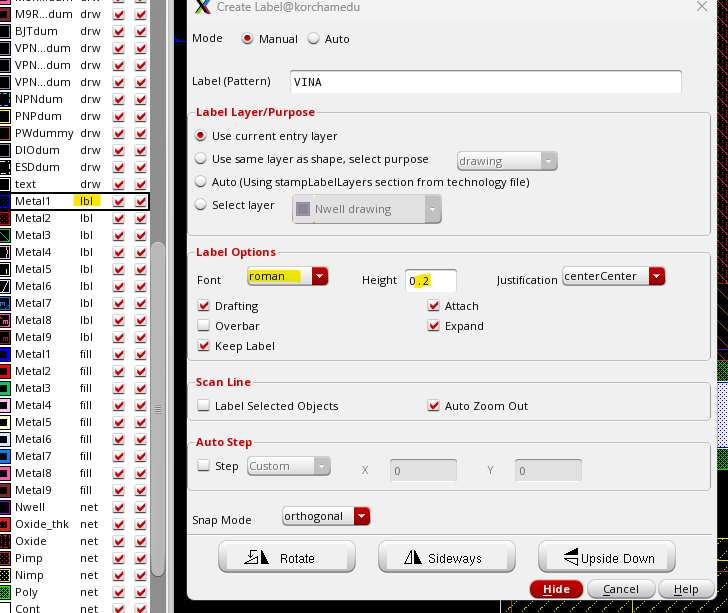 Metal1 lbl (label)을 눌러주고 단축키 L을 눌러서 라벨을 만들어서 메탈에 붙여준다.